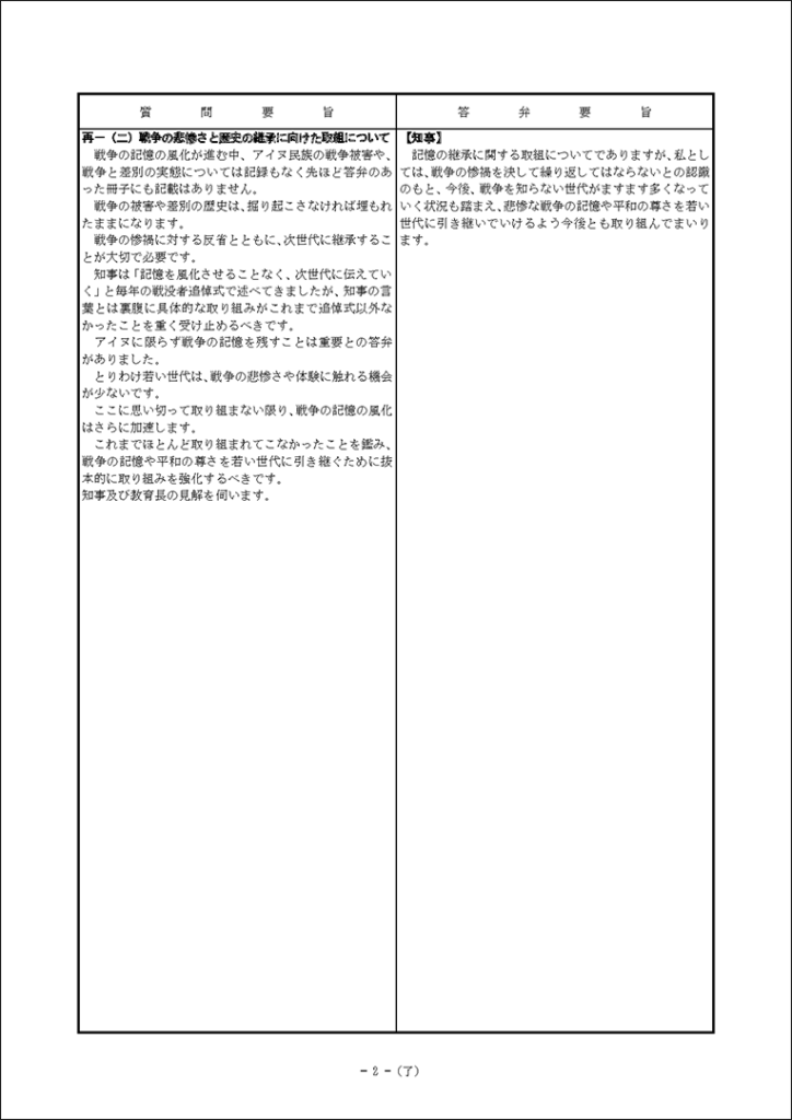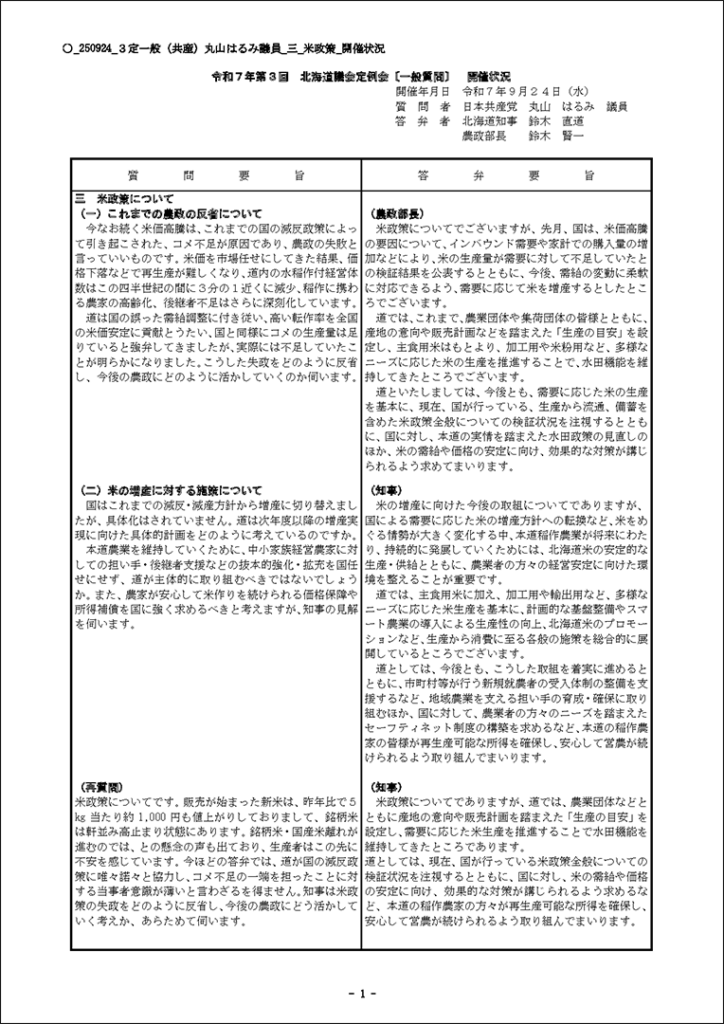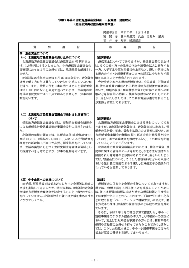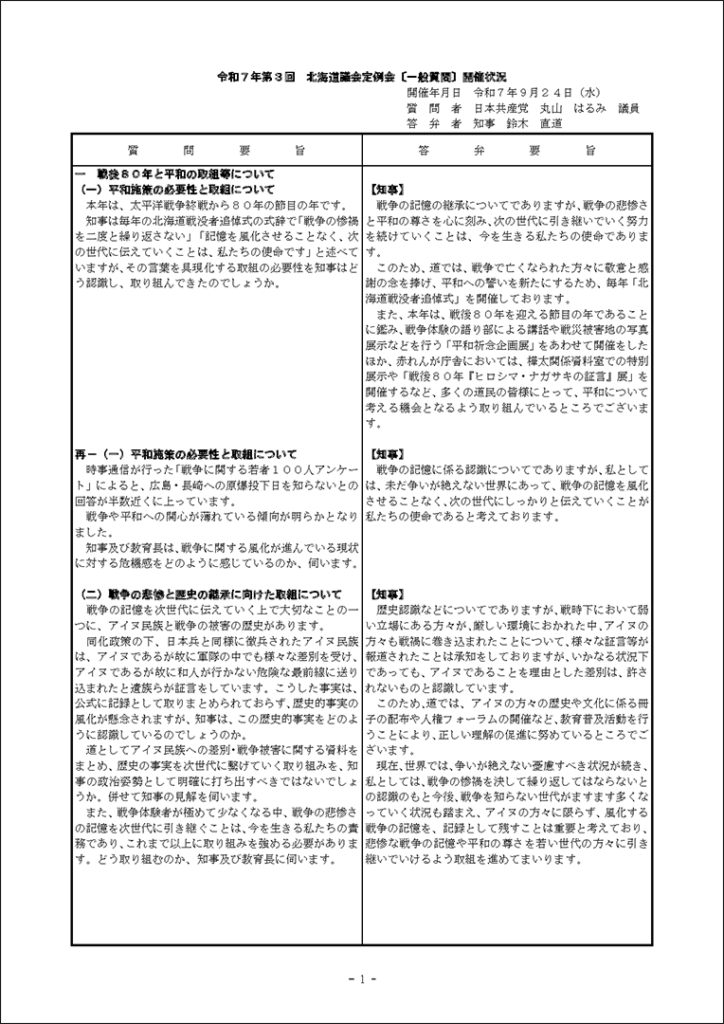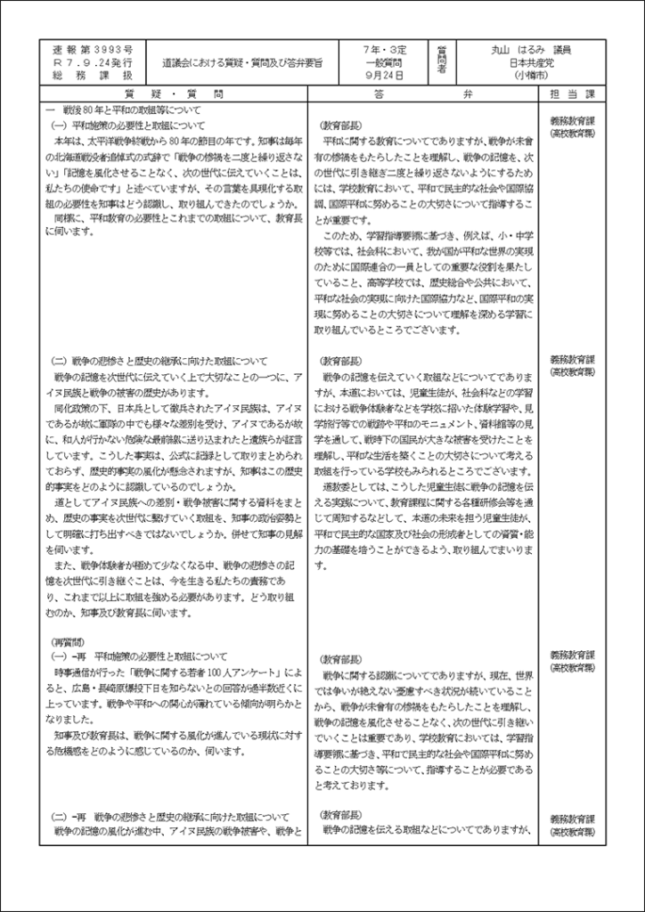 丸山はるみ議員:2025年第3回定例会:一般質問(2025年9月24日) 2025年9月26日 by 事務局 1.戦後80年と平和の取組み等について(答弁者:知事) 1ー2.戦後80年と平和の取組み等について(答弁:教育部長) 3.米政策について(答弁:知事、農政部長) 4.最低賃金について(答弁者:知事、経済部長) 5.エネルギー政策等について