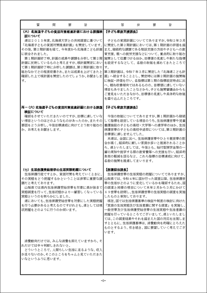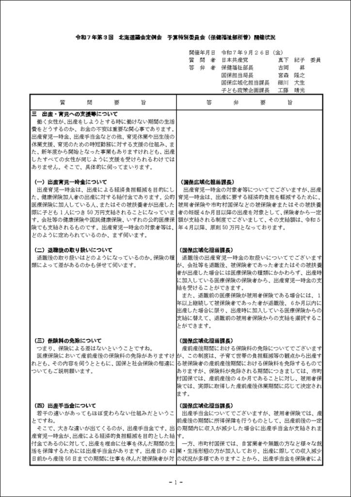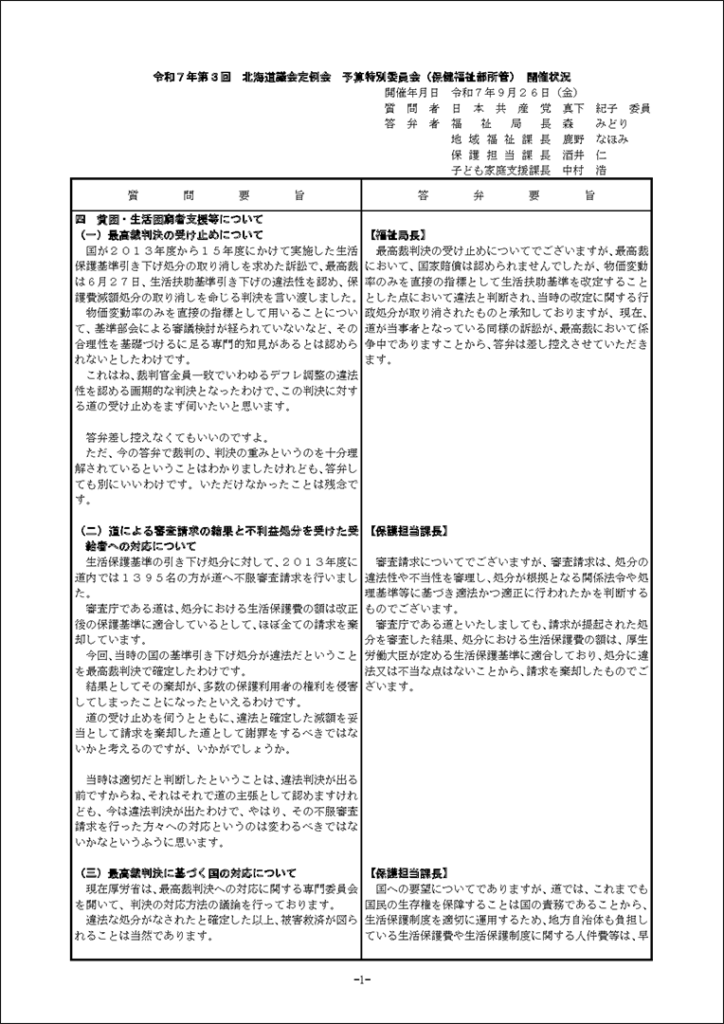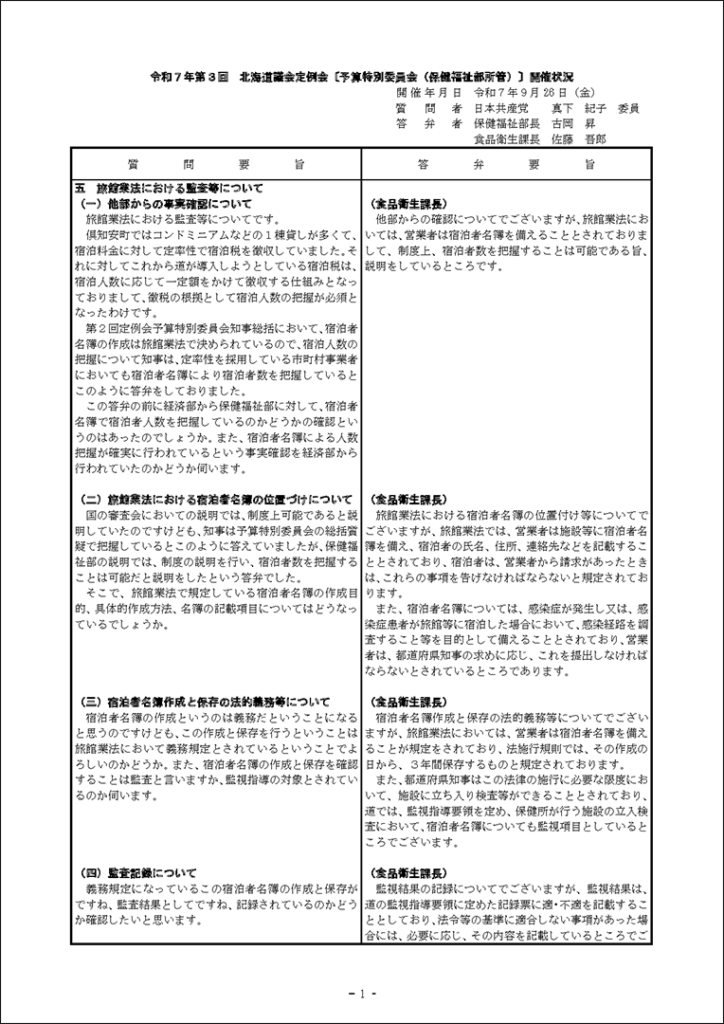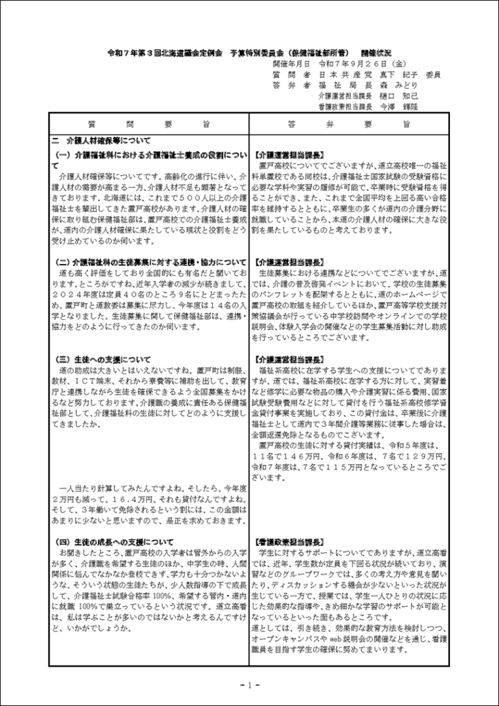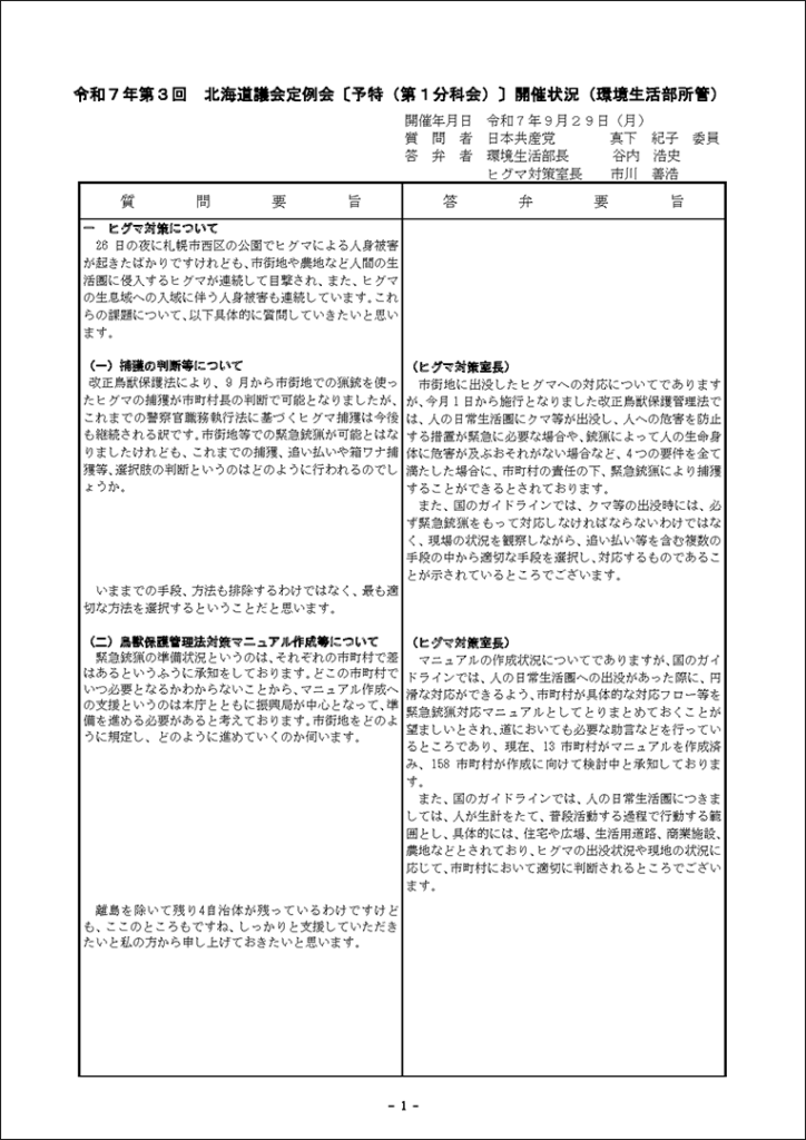 真下紀子議員:2025年第3回定例会:予算特別委員会第1分科会(2025年9月29日) 2025年9月27日 by 事務スタッフ 1.ヒグマ対策について(答弁:環境生活部長、ヒグマ対策室長) 2.介護人材確保について(答弁:福祉局長、介護運営担当課長、看護政策担当課長) 3.出産・育児への支援等について(答弁:保健福祉部長、国保担当局長、国保広域化担当課長、子ども政策企画課長) 4.貧困・生活困窮者支援等について(答弁:福祉局長、地域福祉課長、保護担当課長、子ども家庭支援課長) 5.旅館業法における監視等について(答弁:保健福祉部長、食品衛生課長)