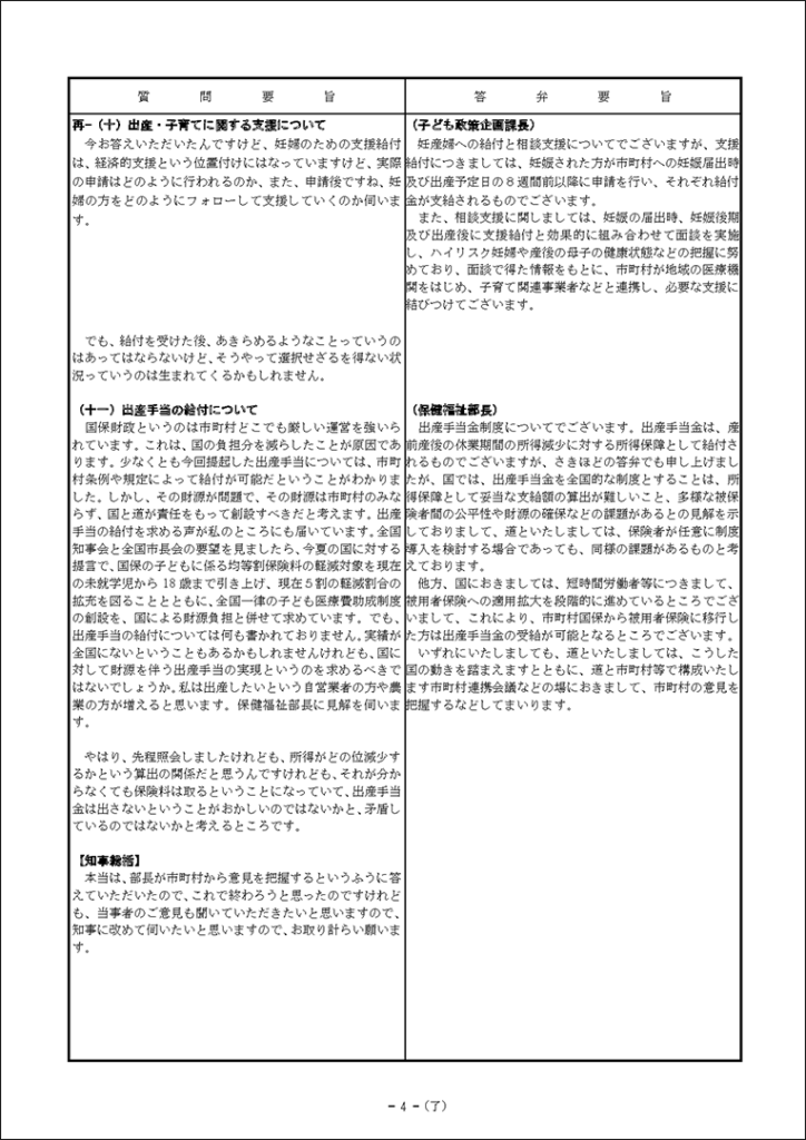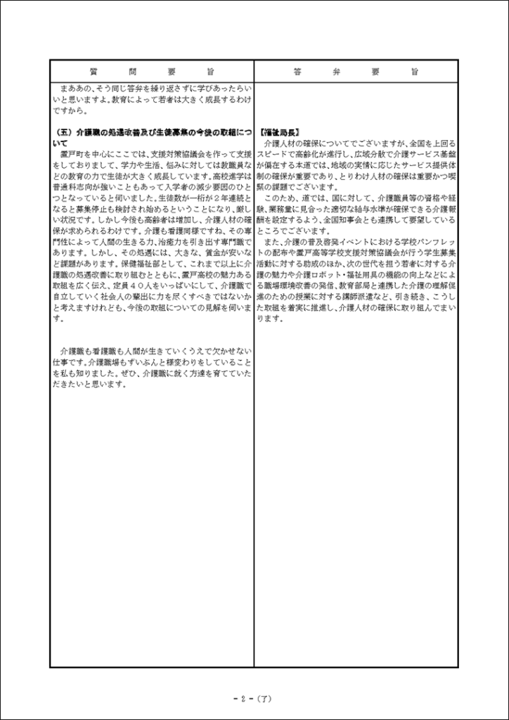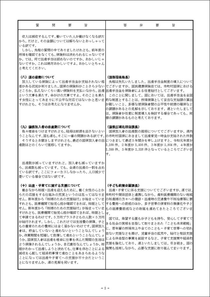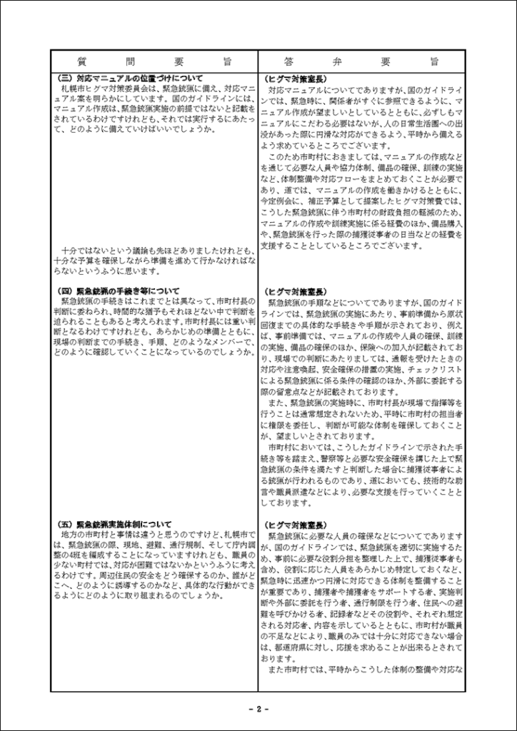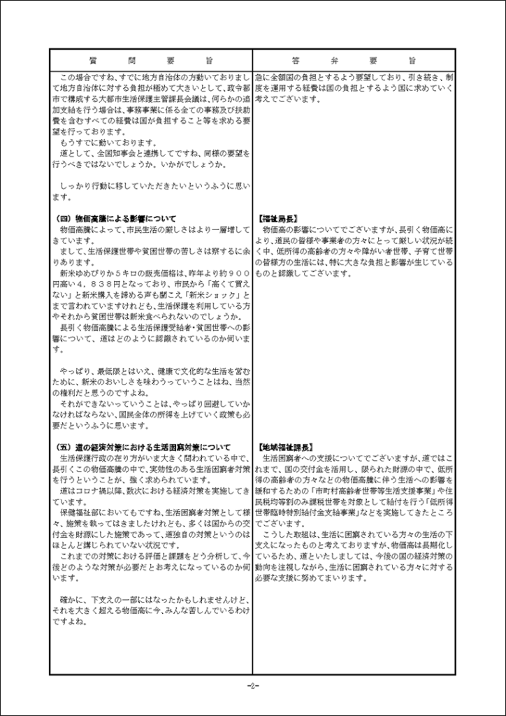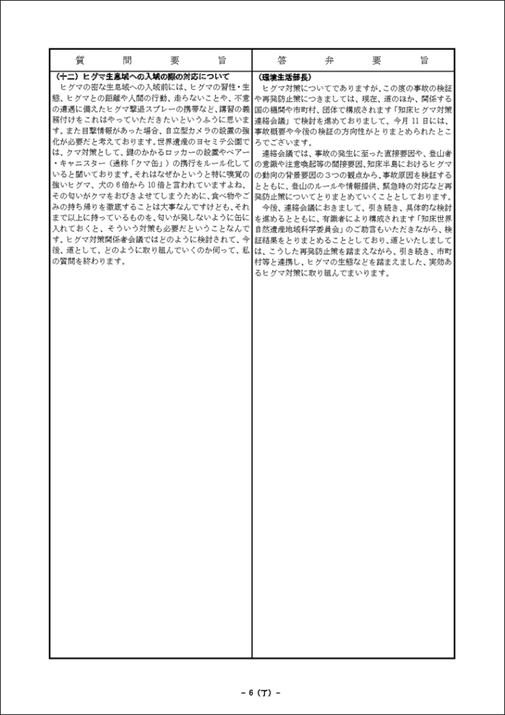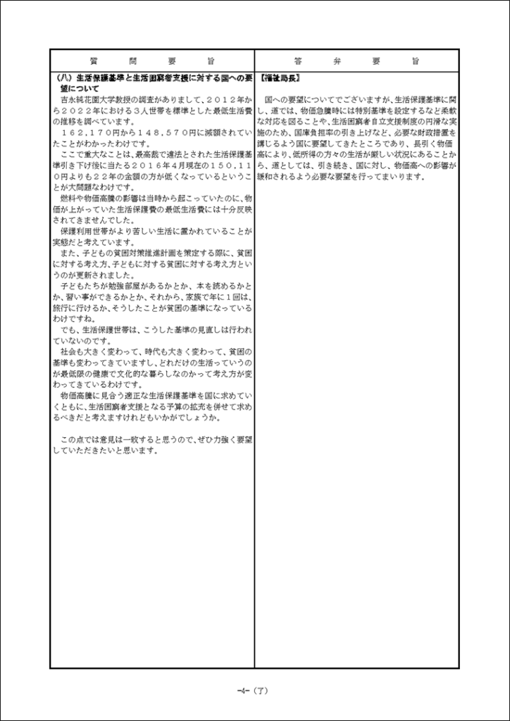 真下紀子議員:2025年第3回定例会:予算特別委員会第1分科会(2025年9月29日) 2025年9月27日 by 事務スタッフ 1.ヒグマ対策について(答弁:環境生活部長、ヒグマ対策室長) 2.介護人材確保について(答弁:福祉局長、介護運営担当課長、看護政策担当課長) 3.出産・育児への支援等について(答弁:保健福祉部長、国保担当局長、国保広域化担当課長、子ども政策企画課長) 4.貧困・生活困窮者支援等について(答弁:福祉局長、地域福祉課長、保護担当課長、子ども家庭支援課長) 5.旅館業法における監視等について(答弁:保健福祉部長、食品衛生課長)