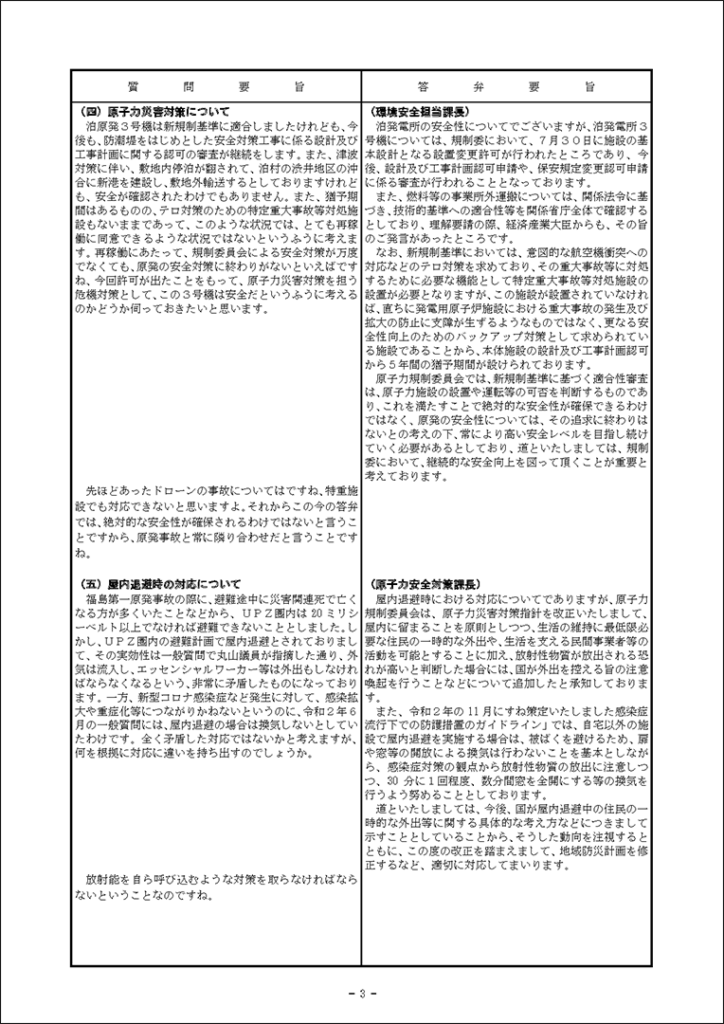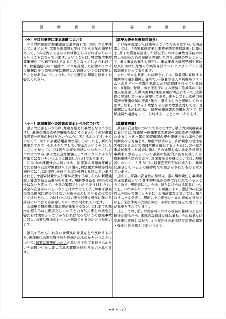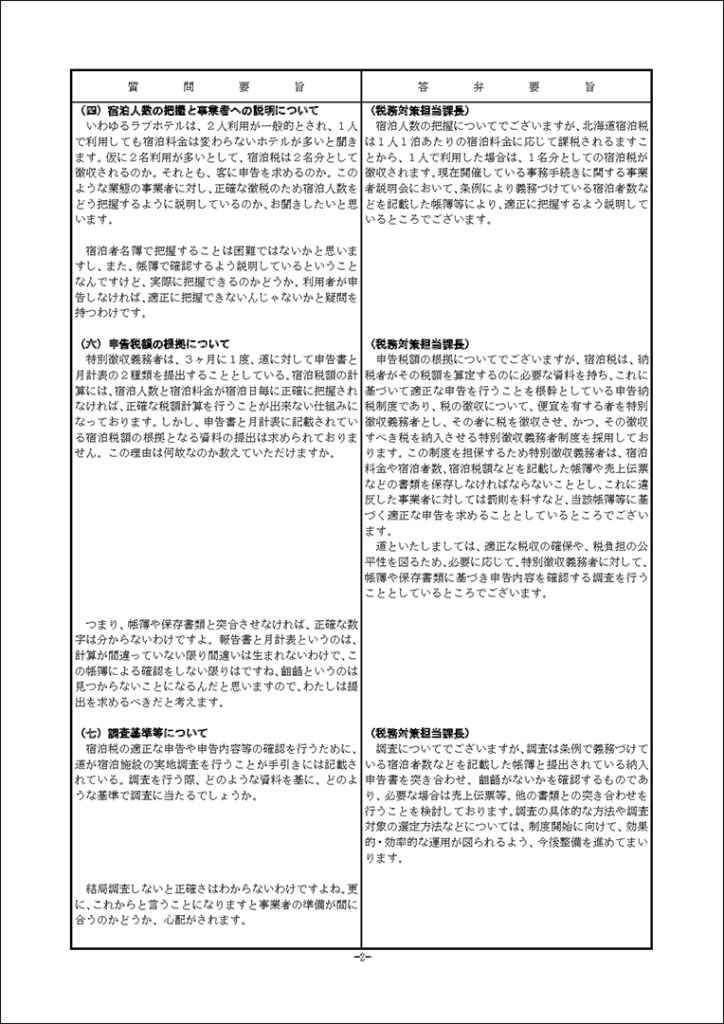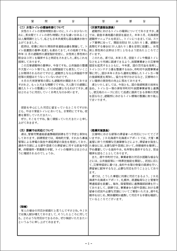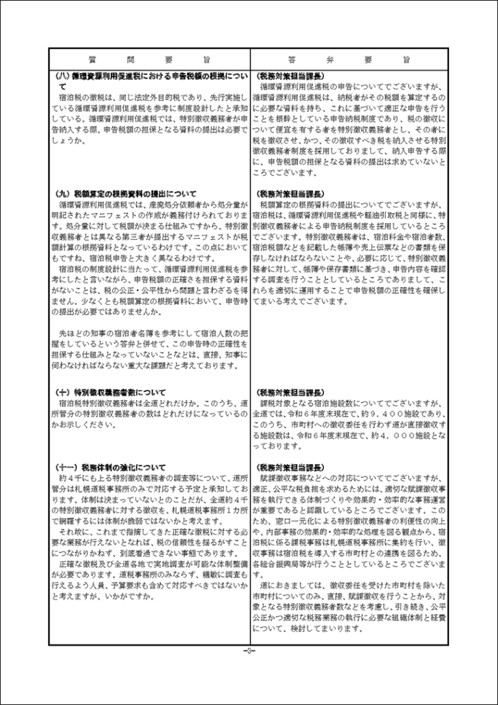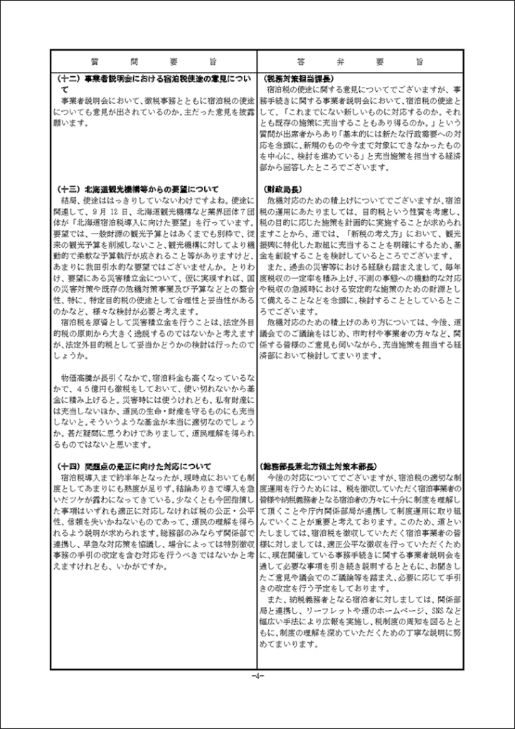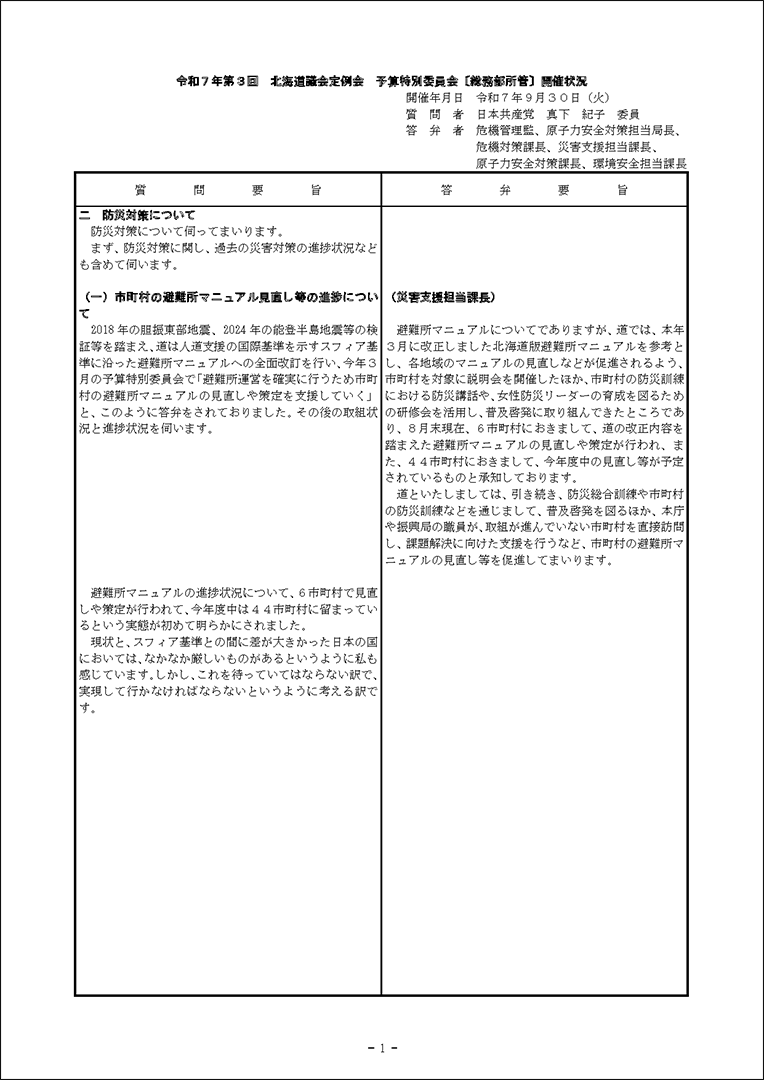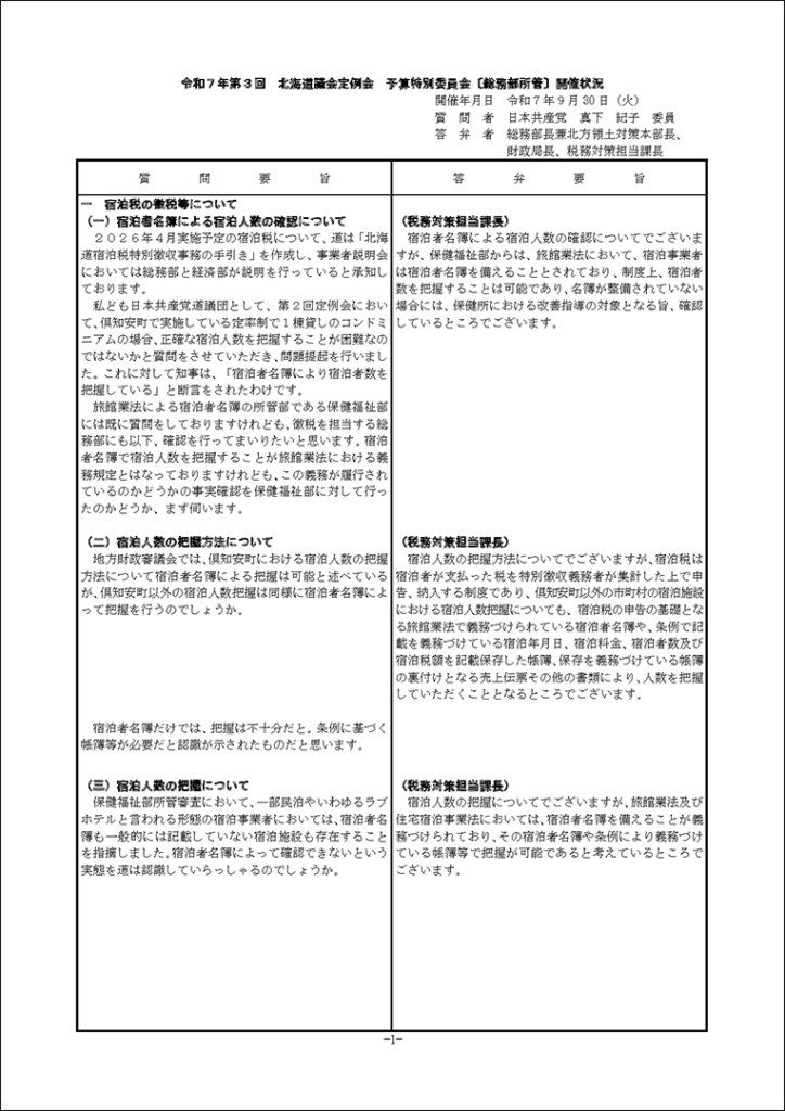真下紀子議員:2025年第3回定例会:予算特別委員会(総務部)(2025年9月30日) 2025年9月30日 by 事務スタッフ 1.宿泊税の徴税等について(答弁:総務部兼北方領土対策本部長、財政局長、税務対策担当課長) 2.防災対策について(答弁:危機管理監、原子力安全対策局長、危機対策課長、災害支援担当課長、原子力安全対対策課長、環境安全担当課長)